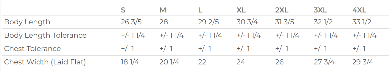 6.1 oz./yd² (US), 10 oz/L yd (CA), 100% ring-spun cotton, 30 singles